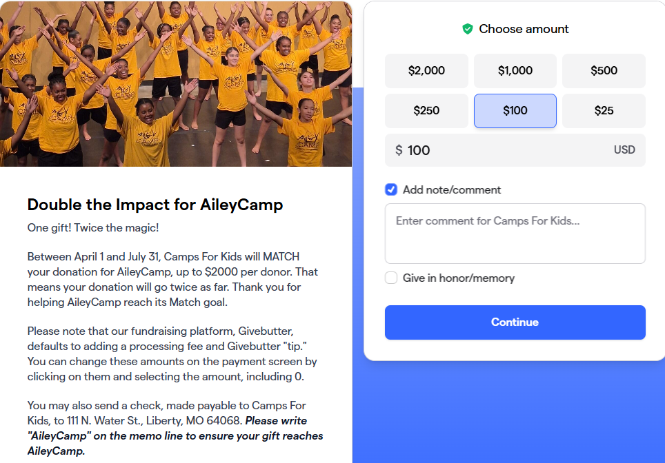 *You MUST note on check or use the designated AileyCamp match form online for KCFAA to receive the matching donation!